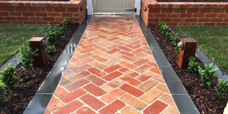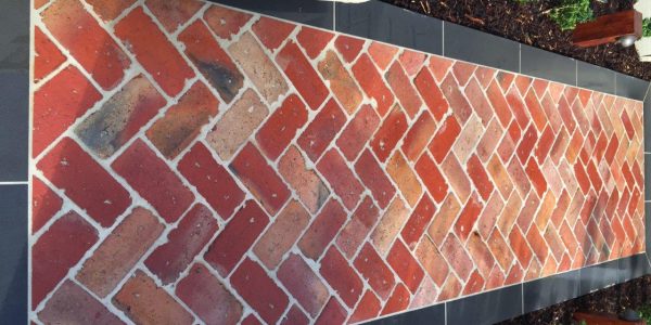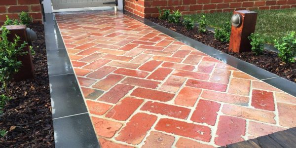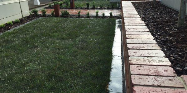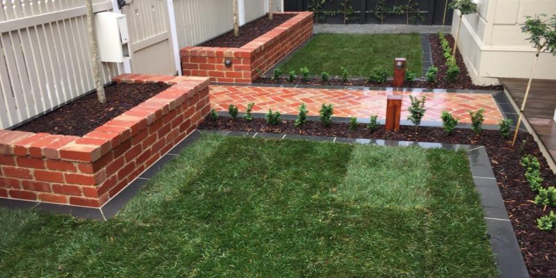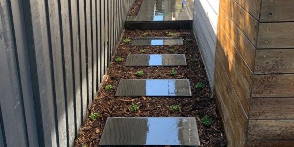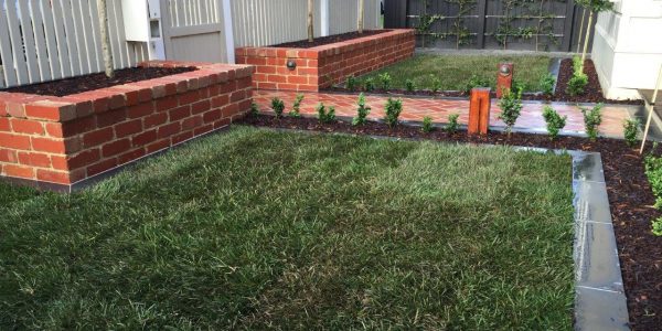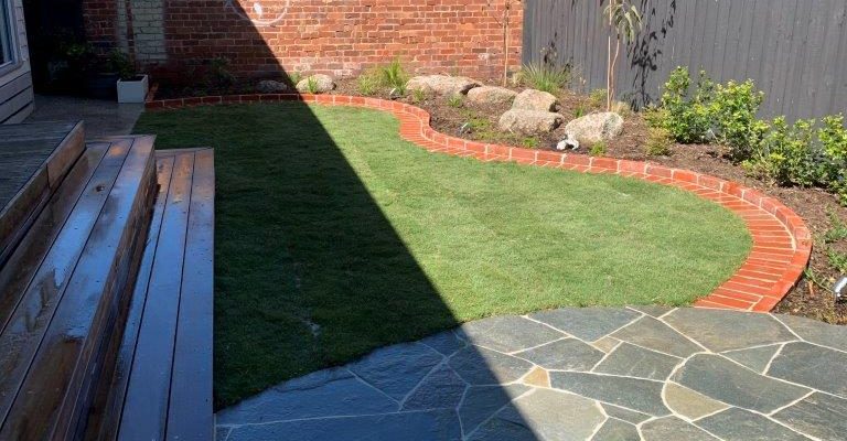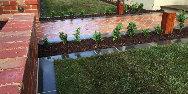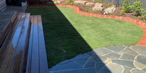 The owners of this house needed a solution to get access to the front door and to make the small front yard usable with a series of steps using the bluestone paving. A small modwood clad block wall was constructed on the low side of the paving. A bluestone step down was also built along the edge of the turf and the new lawn was close to a level area. The area was finished with soil mulch and pebbles and the owner was keen to install plants themselves.